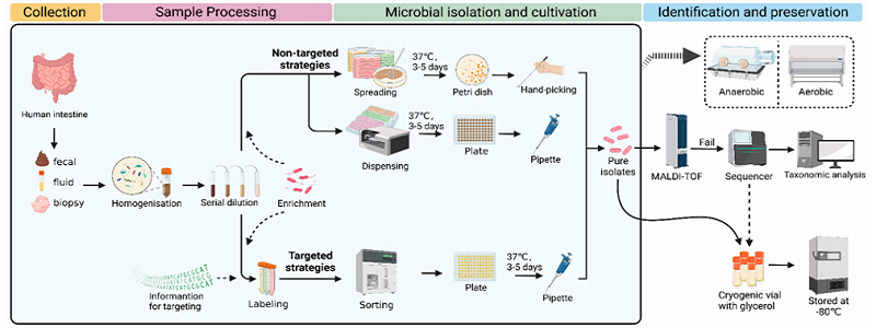 文獻綜述了人類腸道微生物的分離和培養(yǎng)策略,重點介紹了培養(yǎng)組學的非靶向和靶向策略。非靶向策略通過在多種培養(yǎng)基上培養(yǎng)樣本,盡可能多地分離微生物;靶向策略則利用分子生物學、生物信息學等技術(shù),針對特定微生物進行分選和培養(yǎng)。