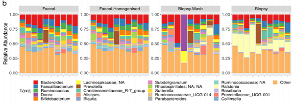研究結(jié)果:配對糞便和直腸活檢清洗樣本的細菌特征非常相似,驗證了糞便樣本作為直腸活檢相關(guān)微生物群的便捷替代品的用途。