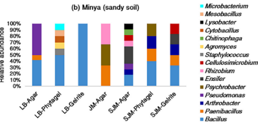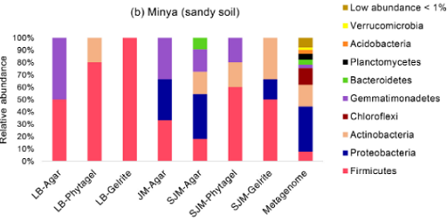根際和根相關(guān)細菌是作物生產(chǎn)和可持續(xù)農(nóng)業(yè)的關(guān)鍵組成部分。然而,這些有益細菌的利用通常受到傳統(tǒng)培養(yǎng)技術(shù)的限制,因為大多數(shù)土壤微生物不能使用標準實驗室培養(yǎng)基進行培養(yǎng)。因此,本研究的目的是通過使用宏基因組分析和改進的基于培養(yǎng)的方法,提高可培養(yǎng)性并研究從埃及三個地點收集的小麥根際微生物組中的細菌群落的多樣性,并對比土壤特征。