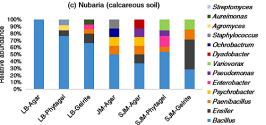 本研究使用改進的培養(yǎng)依賴型和培養(yǎng)獨立型方案,詳細描述了對比土壤條件下小麥根際微生物組的特征。證明,培養(yǎng)基制備的改進(在培養(yǎng)基制備過程中對磷酸鹽和膠凝劑進行單獨滅菌)和使用替代固化劑可有效提高與小麥根際相關(guān)的細菌群落的可培養(yǎng)性。我們認為,應(yīng)該并行應(yīng)用不同的培養(yǎng)策略,以將更多的細菌帶入培養(yǎng)中并發(fā)現(xiàn)新的PGPR候選者,它們是未來可持續(xù)農(nóng)業(yè)的關(guān)鍵參與者。未來的研究需要評估它們在受控和田間條件下促進植物生長的效率。使用各種培養(yǎng)方案恢復(fù)的細菌群落多樣性明顯低于使用獨立培養(yǎng)方法獲得的細菌群落多樣性;因此,需要結(jié)合兩種方法來提供對土壤微生物組的更深入的了解,并揭示與植物健康和生產(chǎn)力相關(guān)的培養(yǎng)和未培養(yǎng)的細菌。