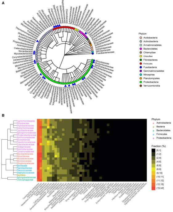 (B)系統(tǒng)發(fā)育樹顯示了細(xì)菌分離物的家族水平聚類。樹梢標(biāo)有分類學(xué)分類。熱圖顯示了每個(gè)聚類中屬于不同功能類別的注釋蛋白質(zhì)的平均百分比。