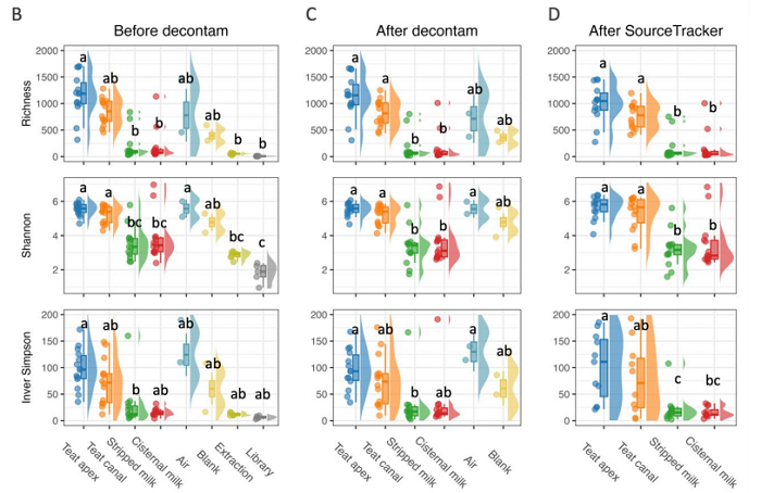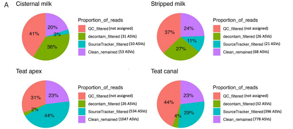 《The impact of kit, environment and sampling contamination on the observed microbiome of bovine milk》的研究以14頭健康奶牛為對象,采集腺泡乳、剝離乳、乳頭頂端、乳頭管樣本,同時(shí)設(shè)置空氣空白、采樣空白、提取空白等多重陰性對照,通過兩種算法系統(tǒng)識別污染,其結(jié)果深刻揭示了低生物量樣本檢測的核心問題: