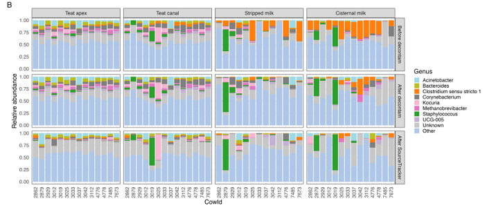 研究顯示:去污染后,牛乳的優(yōu)勢微生物僅為葡萄球菌屬(4.9%)、不動(dòng)桿菌屬(4.2%),多樣性遠(yuǎn)低于乳頭皮膚樣本;此前許多被認(rèn)為是牛乳原生的微生物(如擬桿菌屬、假單胞菌屬),實(shí)為污染導(dǎo)致的“假陽性”,說明有效的去污染流程是獲取真實(shí)微生物組信息的關(guān)鍵。