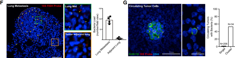 (G) 血液中角蛋白8+18抗體和16S探針染色和定量循環(huán)腫瘤細(xì)胞中的細(xì)菌。