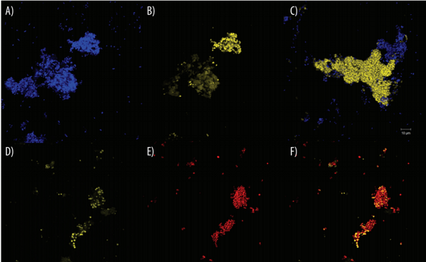 藍色熒光(DAPI染色):呈現(xiàn)活性淤泥中所有微生物的整體分布;紅色熒光(FISH探針標記):定位目標功能微生物。圖像疊加可直接觀察目標菌在總?cè)郝渲械奈恢门c占比,快速判斷目標菌的存活狀態(tài)與富集情況。