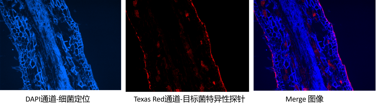 藍(lán)色熒光(DAPI染色):呈現(xiàn)根系樣本中所有細(xì)菌的整體分布;紅色熒光(FISH探針標(biāo)記):定位目標(biāo)功能微生物。圖像疊加可直接觀(guān)察目標(biāo)菌在總?cè)郝渲械奈恢门c占比,快速判斷目標(biāo)菌的存活狀態(tài)與富集情況。