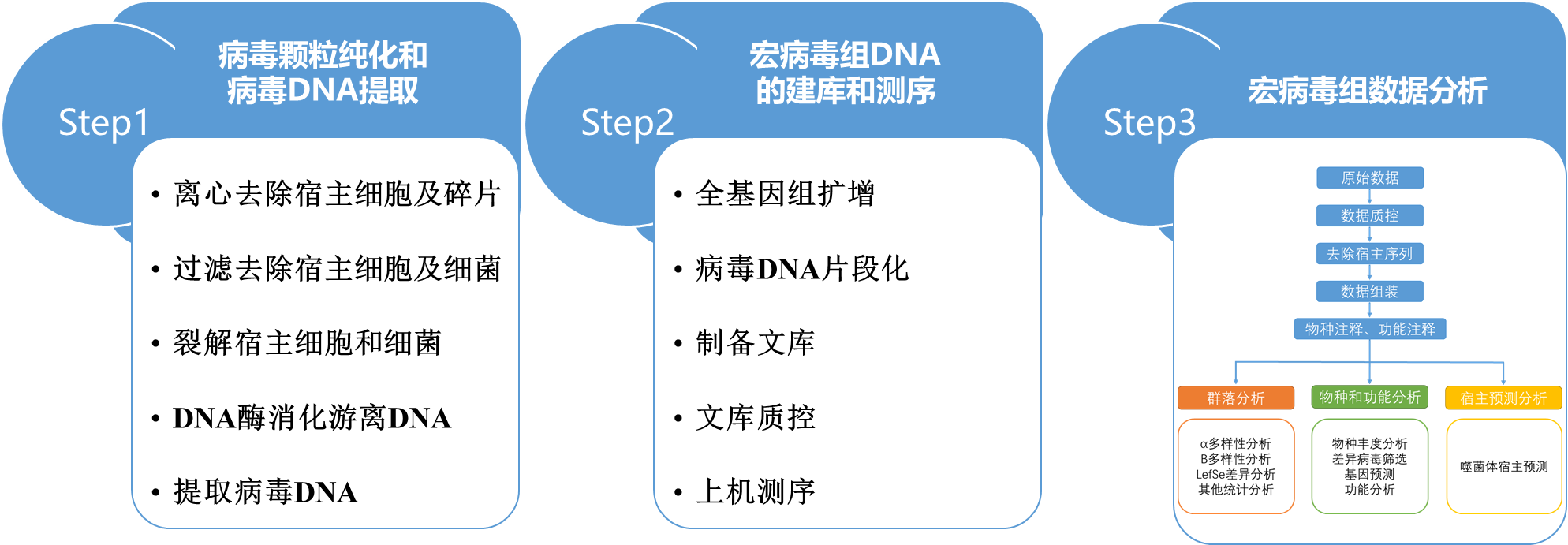 宏病毒組(Virome)是在宏基因組學(xué)理論的基礎(chǔ)上,結(jié)合現(xiàn)有的病毒分子生物學(xué)檢測技術(shù)而興起的一個(gè)新的學(xué)科分支。 宏病毒組直接以樣本中所有病毒的遺傳物質(zhì)為研究對象,能夠快速準(zhǔn)確的鑒定樣本中所有的病毒組成,不僅在病毒發(fā)現(xiàn)、病毒溯源、微生物預(yù)警等研究方面具有重要作用,在病毒的起源和進(jìn)化模式、遺傳多樣性和地理分布等研究方面也具有重要意義。宏病毒組學(xué)應(yīng)用廣泛,可應(yīng)用于人或動(dòng)物腸道或者血液樣本、水樣、土壤樣本等的研究。