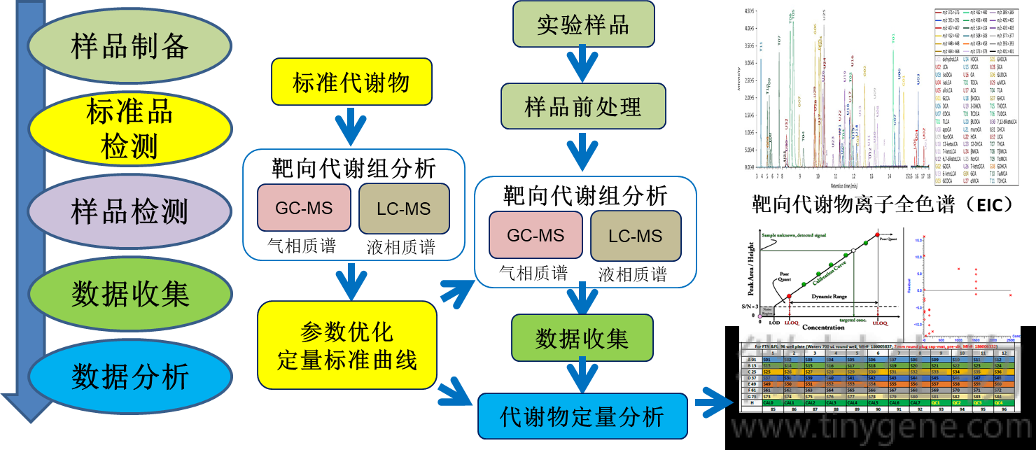 靶向代謝組學(xué)是對(duì)特定的代謝物群進(jìn)行檢測(cè)與分析。分析時(shí)加入了標(biāo)準(zhǔn)品的定量分析,用以對(duì)特定代謝物絕對(duì)濃度的定量檢測(cè)。常規(guī)分析法有氣質(zhì)聯(lián)用(GC-MS)和液質(zhì)聯(lián)用(LC-MS),我們優(yōu)先利用LC-MS的方法進(jìn)行代謝組分析[1],然后通過(guò)與相同分析條件下標(biāo)準(zhǔn)品的分析結(jié)果進(jìn)行比對(duì),最終完成目標(biāo)代謝群定性和定量的分析。
