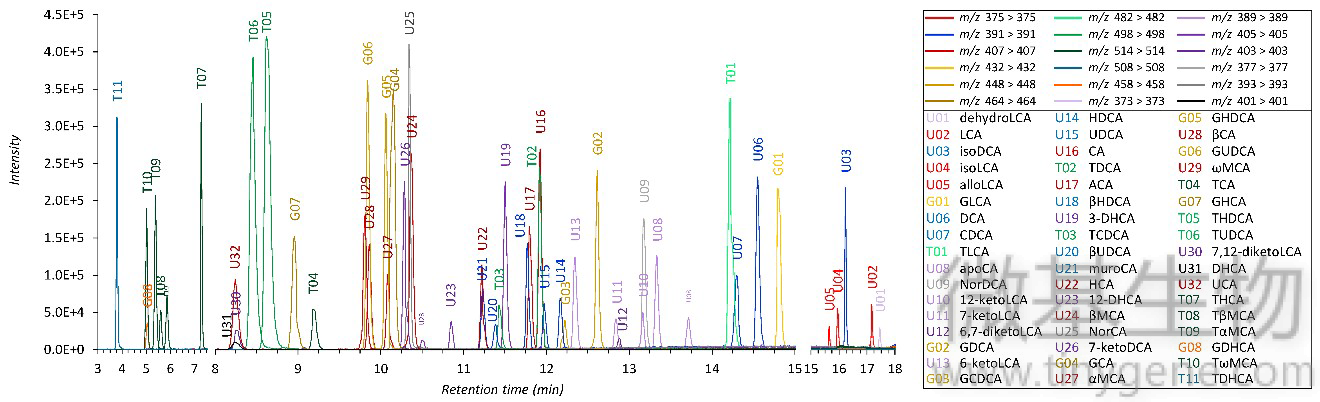 所有單個(gè)膽汁酸的提取離子色譜(EIC、全譜)