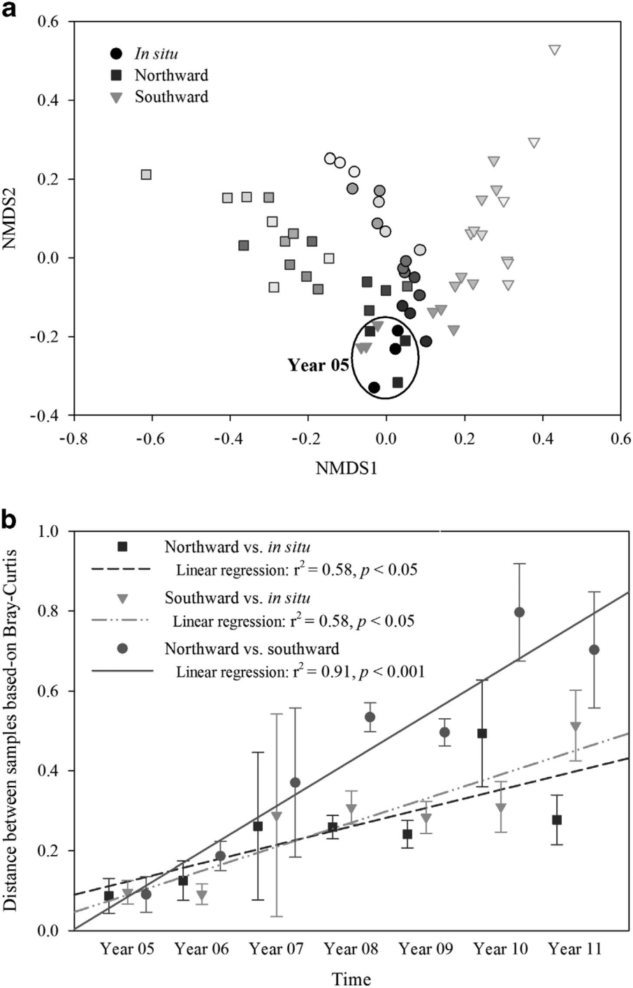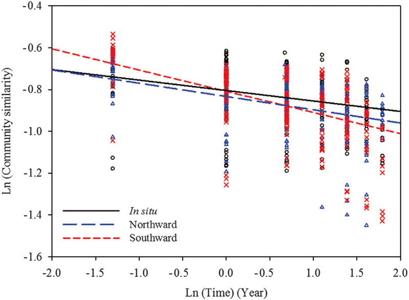微生物隨時間衰減的斜率可以用來衡量微生物群落的相似性。本研究中,在各個樣本的微生物群落中都存在顯著的的時間衰減關(guān)系。向北、向南移植的土壤中,微生物隨時間衰減的斜率均比原位土壤的斜率大,尤其是在向南移植的土壤中。