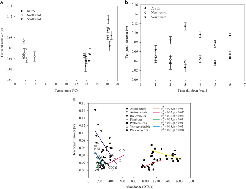 隨著溫度的升高/降低,微生物的變化率也相應(yīng)地增加。隨著土壤向南移植,氣候變暖,微生物群落的波動性增大,微生物群落的變化增加。向南移植對土壤微生物群落的變化具有出更好的效果。有趣的是,研究還發(fā)現(xiàn)細(xì)菌群落(門水平)的改變與分類學(xué)的分度有關(guān)。其中變形菌門、擬桿菌門和疣微菌門與門的豐度呈負(fù)相關(guān),而酸桿菌門、放線菌門、后壁菌門和浮霉菌門與門的豐度呈正相關(guān)。