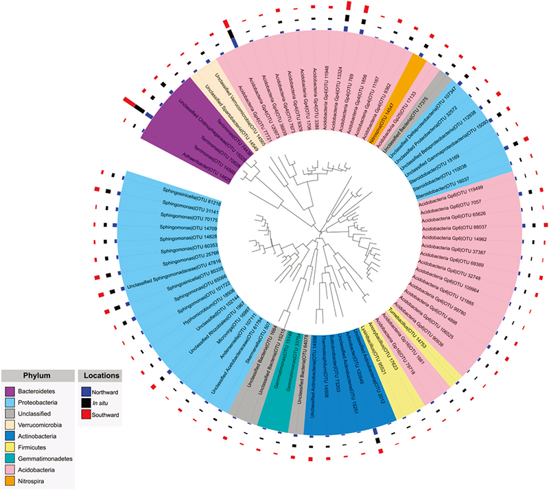 微生物的演替與環(huán)境因子之間的關(guān)系用CCA分析如下。結(jié)果表明,向北移植的土壤中,微生物群落的多樣性與土壤的物理化學(xué)因子有關(guān);而向南移植的土壤中,微生物群落的多樣性受溫度和降水的影響較大。