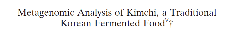 Jung, J. Y., S. H. Lee, J. M. Kim, M. S. Park, J. W. Bae, Y. Hahn, E. L. Madsen and C. O. Jeon (2011). “Metagenomic analysis of kimchi, a traditional Korean fermented food.” Appl Environ Microbiol 77(7): 2264-2274.