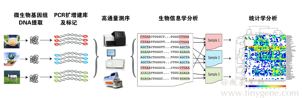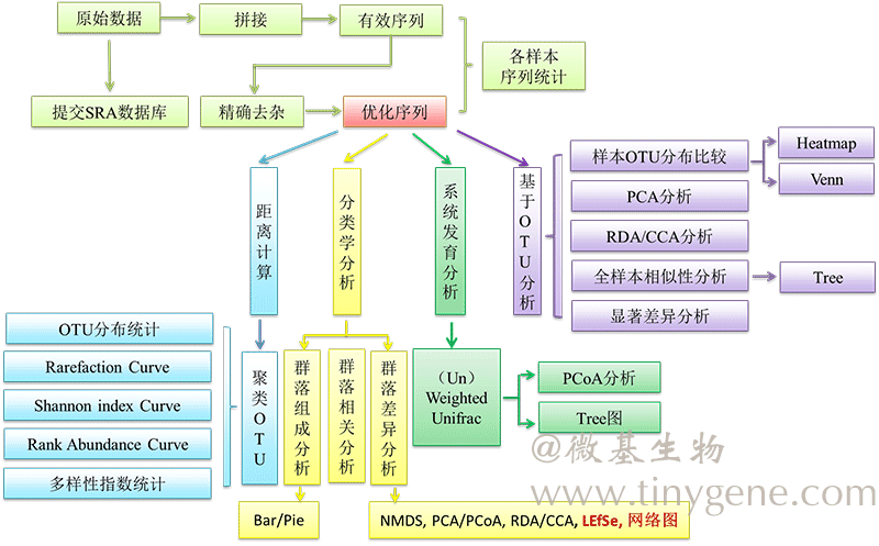 目前市面上常用的用于研究環(huán)境微生物的高通量測序平臺有Illumina MiSeq,Roche 454和Ion Torrent PGM。Illumina MiSeq平臺憑借其測序讀長長、測序周期短、通量大等特點,成為使用普遍使用的測序平臺。 高通量分析流程: