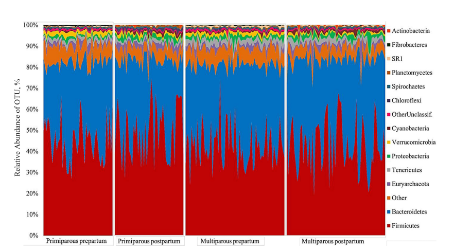 研究領(lǐng)域:牛瘤胃微生物組 研究物種: 細(xì)菌16S rRNA V4區(qū)、真核生物18S rRNA V9區(qū) 高通量測序平臺:Illumina MiSeq 主要實驗結(jié)果 (1)奶牛初次分娩和多次分娩)產(chǎn)前產(chǎn)后的16S rRNA序列集合的微生物組成的OTU相對豐度