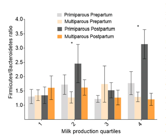 (6)初產(chǎn)奶牛產(chǎn)前產(chǎn)后牛奶的厚壁菌門/擬桿菌門顯著高于多次生產(chǎn)的奶牛