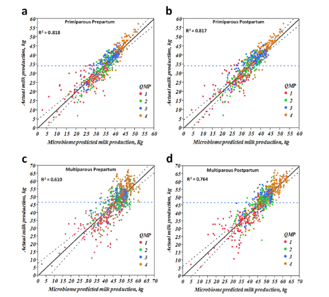 (8)用微生物組預(yù)測產(chǎn)犢前后的牛奶產(chǎn)量和實際每周產(chǎn)奶平均值呈顯著相關(guān)性