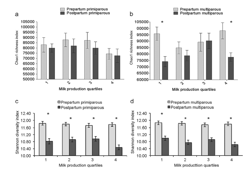 (5)不同時期初次生產(chǎn)和多次生產(chǎn)的奶牛在產(chǎn)前和產(chǎn)后奶牛產(chǎn)奶量,豐度指數(shù)Chao1(a和b)和Shannon(c和d)