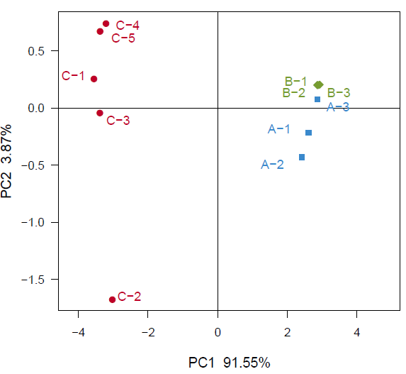 注:PC1 和PC2 是兩個主坐標成分,PC1 表示盡可能最大解釋數(shù)據(jù)變化的主坐標成分,PC2 為解釋余下的變化度中占比例最大的主坐標成分,PC3 等依次類推。
