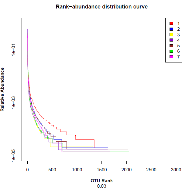Rank-abundance曲線是分析多樣性的一種方式。構(gòu)建方法是統(tǒng)計單一樣品中,每一個OTU 所含的序列數(shù),將OTUs 按豐度(所含有的序列條數(shù))由大到小等級排序,再以O(shè)TU 等級為橫坐標(biāo),以每個OTU 中所含的序列數(shù)(也可用OTU 中序列數(shù)的相對百分含量)為縱坐標(biāo)做圖。