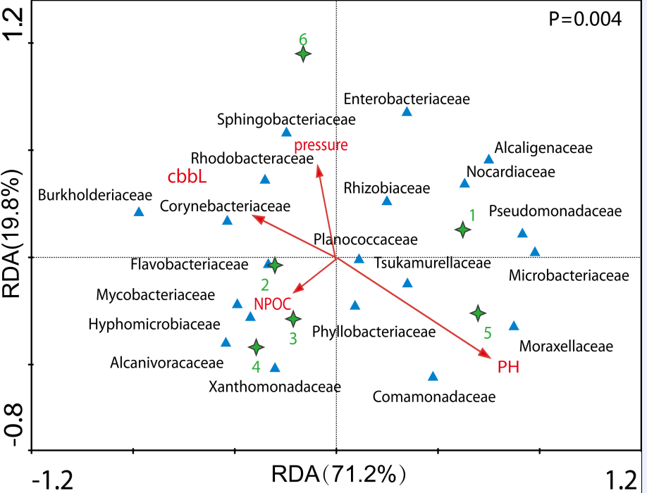注:圖中數(shù)字表示樣品名,不同顏色或形狀表示不同環(huán)境或條件下的樣本組;箭頭表示環(huán)境因子;圖中藍(lán)色上三角表示不同屬的細(xì)菌;物種與環(huán)境因子之間的夾角代表物種與環(huán)境因子間的正、負(fù)相關(guān)關(guān)系(銳角:正相關(guān);鈍角:負(fù)相關(guān);直角:無(wú)相關(guān)性);由不同的樣本向各環(huán)境因子做垂線,投影點(diǎn)越相近說(shuō)明樣本間該環(huán)境因子屬性值越相似,即環(huán)境因子對(duì)樣品的影響程度相當(dāng)。