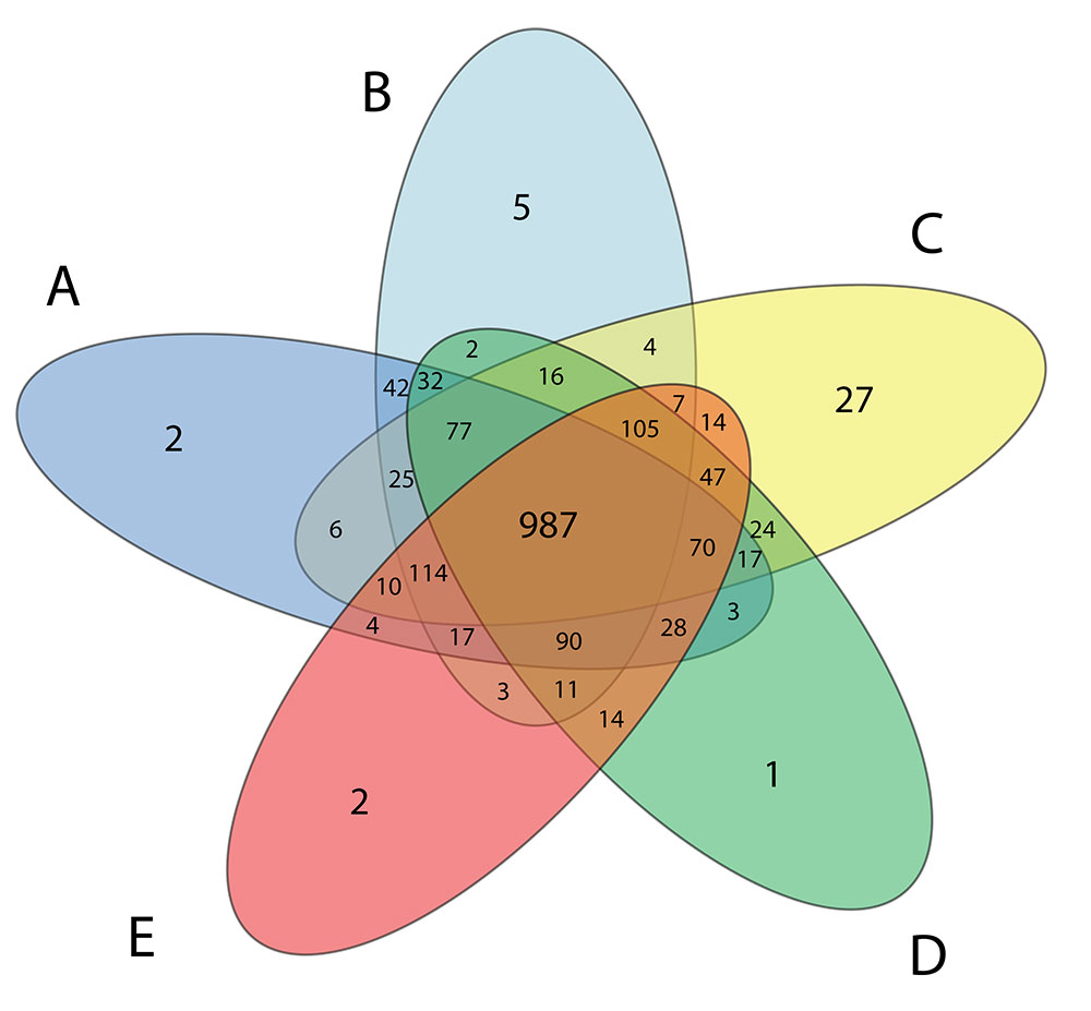 注:不同的顏色代表不同的樣本,如果兩個(gè)不同顏色圓圈重疊的區(qū)域標(biāo)注有數(shù)字100,說明這兩個(gè)樣品均有序列被劃分入相同的OTU 中,且這樣的OTU 有100 個(gè)。圖中的樣品數(shù)量一般為2~5 個(gè)。