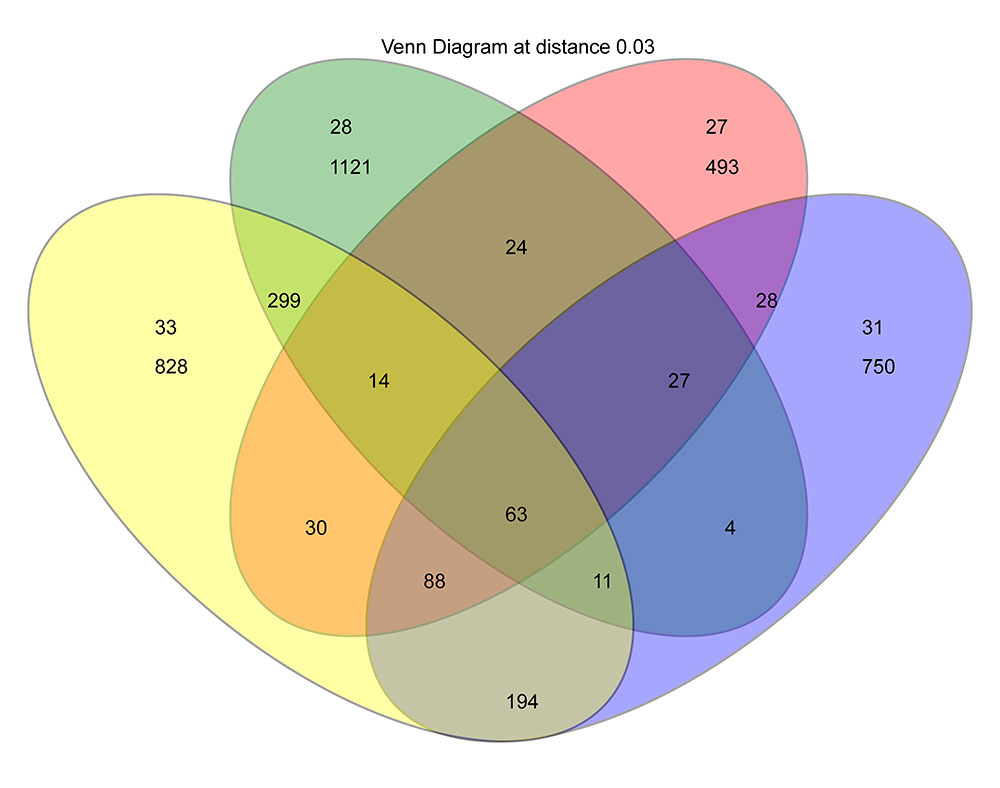 venn 圖可用于統(tǒng)計(jì)多個(gè)樣品中所共有和獨(dú)有的OTU 數(shù)目,可以比較直觀的表現(xiàn)環(huán)境樣品的OTU 數(shù)目組成相似性及重疊情況。通常情況下,分析時(shí)選用相似水平為97%的OTU 樣品表。