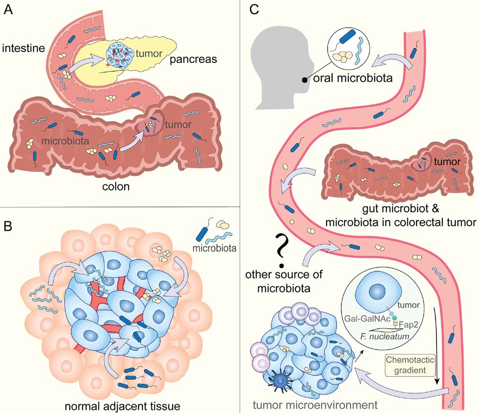 腫瘤內(nèi)微生物群的來源:A) 粘膜器官。腸道微生物會擾亂粘膜屏障并進(jìn)入腫瘤部位,而胰腺癌的瘤內(nèi)細(xì)菌則通過胰管進(jìn)入腫瘤部位。B) NAT是腫瘤內(nèi)微生物群的潛在來源。C) 循環(huán)系統(tǒng)。腫瘤內(nèi)微生物通過血行傳播從口腔、腸道、腫瘤和其他部位進(jìn)入腫瘤部位。