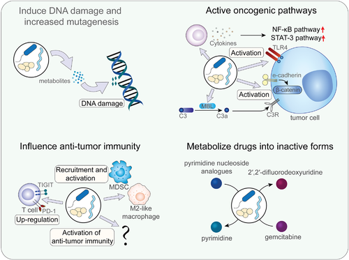 誘導(dǎo)腫瘤發(fā)生的兩個主要機制包括引起DNA損傷和激活致癌途徑。腫瘤內(nèi)微生物群也影響抗腫瘤免疫并發(fā)揮復(fù)雜的作用。此外,腫瘤內(nèi)微生物群代謝化療藥物并導(dǎo)致化療耐藥。