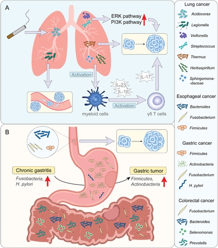 不同腫瘤中腫瘤內(nèi)微生物群的異質(zhì)性 A) 肺腫瘤。有幾種細(xì)菌會影響肺癌的進(jìn)展和轉(zhuǎn)移。這些細(xì)菌通過不同的途徑發(fā)揮作用。