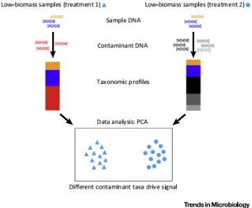 低微生物生物量樣品的兩個處理組(三角形和圓形)在微生物組成上沒有差異(樣品DNA顏色相同,藍(lán)色和橙色)。然而,由于處理組處理背景不同的,污染物DNA的類型和豐度的差異(紅色和黑色)驅(qū)動了信號,從而導(dǎo)致處理組有不同的微生物組成。