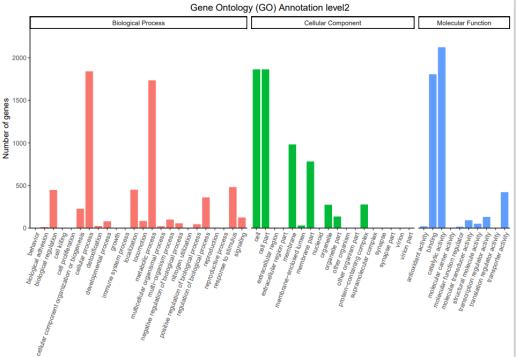 7、 GO注釋: GO數(shù)據(jù)庫分別從功能、參與的生物途徑及細胞中的定位對基因產(chǎn)物進行了標準化描述,所謂的GO,是生物學功能注釋的一個標準詞匯表術語(GO term),將基因的功能分為三部分:基因執(zhí)行的分子功能(Molecular Function), 基因參與的生物學過程(Biological Process), 基因所處的細胞組分(Cellular Component)。對每個分類下比對上的基因數(shù)進行統(tǒng)計。