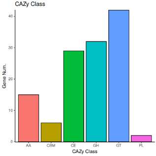 11、CAZy注釋:CAZy(Carbohydrate-active enzymes,碳水化合物活性酶)數(shù)據(jù)庫是研究碳水化合物酶的專業(yè)級數(shù)據(jù)庫,主要涵蓋6大功能類:糖苷水解酶(Glycoside Hydrolases,GHs);糖基轉移酶(Glycosyl Transferases,GTs);多糖裂合酶(Polysaccharide Lyases,PLs);碳水化合物酯酶(Carbohydrate Esterases,CEs);輔助氧化還原酶(Auxiliary Activities , AAs);碳水化合物結合模塊(Carbohydrate-Binding Modules,CBMs)。對每個分類下比對上的基因數(shù)進行統(tǒng)計。