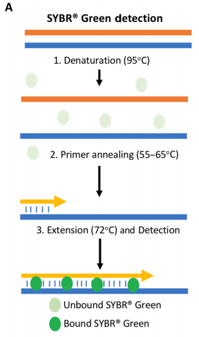 A.SYBR®Green 檢測:cDNA變性后,引物退火并延伸。在延伸過程中,SYBR Green與雙鏈DNA(dsDNA) 結(jié)合,發(fā)出熒光信號,可被qPCR儀器檢測到。