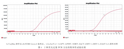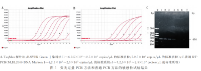 結(jié)果顯示:本試驗建立的TaqMan和SYBR Green I熒光定量PCR方法分別比普通RT-PCR方法的靈敏度高100倍和10倍;TaqMan法比SYBR Green I染料法靈敏度高10倍,說明TaqMan探針法熒光定量PCR方法的靈敏性更高。