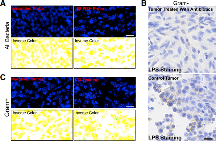 (A) 16S FISH分析(紅色)顯示細(xì)菌在核周區(qū)域呈點(diǎn)狀分布;(B) LPS IHC染色(革蘭氏陰性菌,紅色);(C)LTA染色(革蘭氏陽(yáng)性菌,紅色),藍(lán)色為DAPI染核。