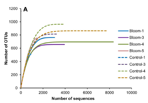 ?。?)赤潮樣本與對照組的稀釋性曲線和樣本豐度柱形圖