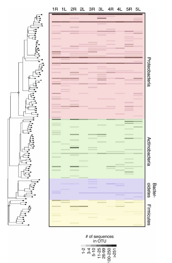 ?。?)無(wú)皮膚病史的五個(gè)樣本左、右手的113個(gè)OUT的系統(tǒng)發(fā)育樹結(jié)構(gòu)豐度