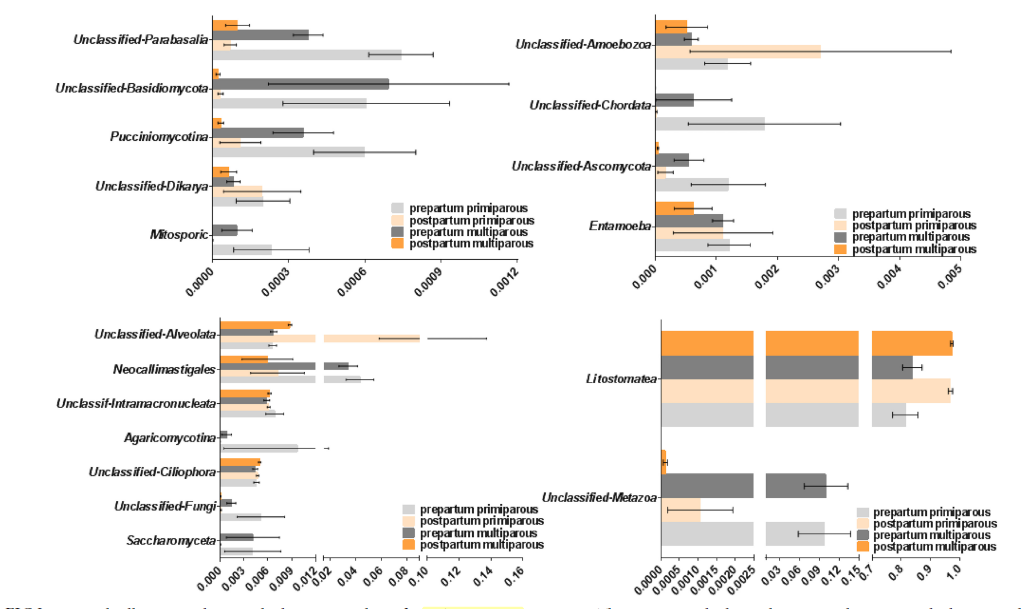 研究領(lǐng)域:牛瘤胃微生物組 研究物種: 細(xì)菌16S rRNA V4區(qū)、真核生物18S rRNA V9區(qū) 高通量測序平臺:Illumina MiSeq 主要實驗結(jié)果 (1)奶牛初次分娩和多次分娩)產(chǎn)前產(chǎn)后的16S rRNA序列集合的微生物組成的OTU相對豐度