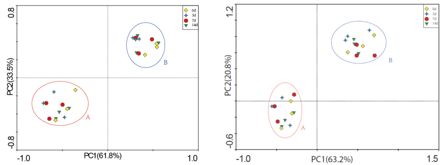 通過PCoA分析,發(fā)現(xiàn)weighted UniFrac和unweighted UniFrac的結(jié)果顯示,不同處理時(shí)間樣本之間的相似性很高,圖中每個(gè)樣本的不同處理分別聚在一起。新鮮凍存與37℃處理14天從系統(tǒng)發(fā)育角度看無顯著差異。