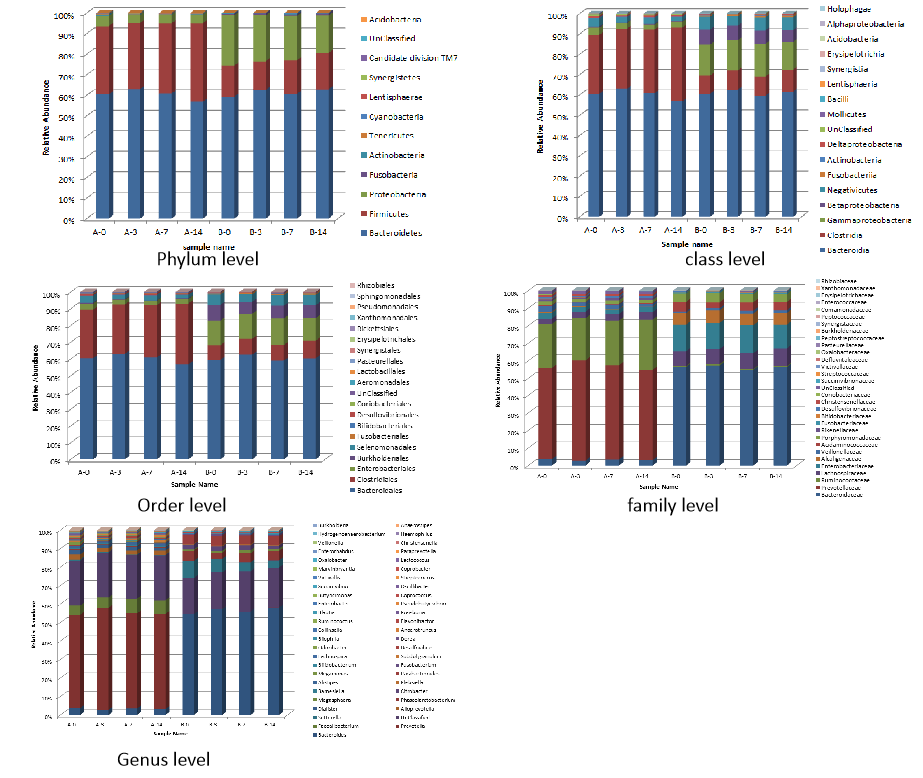 在門、綱、目、科、屬各水平的細(xì)菌相對(duì)豐度構(gòu)成圖中,每個(gè)柱子為一個(gè)處理三個(gè)重復(fù)的均值,不同顏色代表不同的物種,物種信息可見圖例,若某一種細(xì)菌占的比例多,則其在柱子中所占的比例就會(huì)更大。