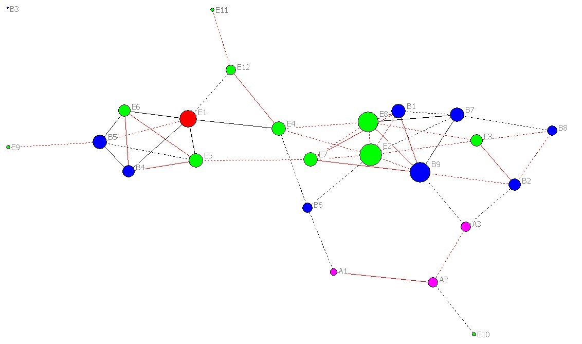 分析方法:選取每樣本1%豐度以上的物種進行雙側(cè)檢驗;在置信度(雙測)為0.05 時,相關(guān)性是顯著的,用虛線表示。在置信度(雙測)為 0.01 時,相關(guān)性是及顯著的,表明物種之間有強相關(guān),用實線表示。相關(guān)系數(shù)為正數(shù),表明物種之間為正相關(guān),用紅色線表示;負相關(guān)用黑線表示。