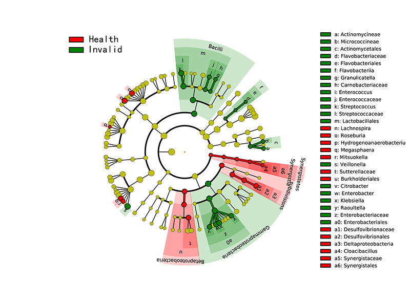 注:左圖為聚類樹,紅色區(qū)域和綠色區(qū)域表示不同分組,樹枝中紅色節(jié)點(diǎn)表示在紅色組別中起到重要作用的微生物類群,綠色節(jié)點(diǎn)表示在綠色組別中起到重要作用的微生物類群,黃色節(jié)點(diǎn)表示的是在兩組中均沒有起到重要作用的微生物類群。圖中英文字母表示的物種名稱在右側(cè)圖例中進(jìn)行展示。右圖為統(tǒng)計(jì)兩個(gè)組別當(dāng)中有顯著作用的微生物類群通過LDA 分析(線性回歸分析)后獲得的LDA 分值。