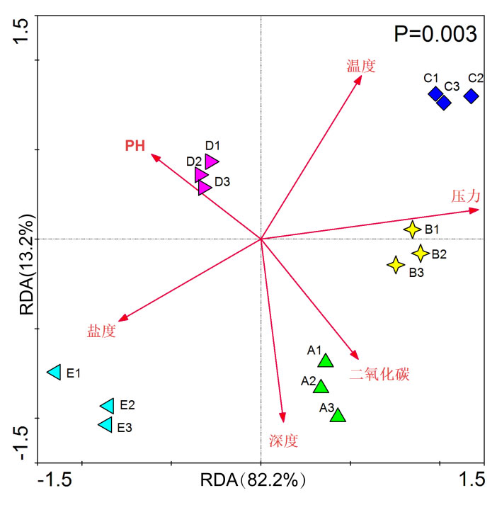 注:圖中數(shù)字表示樣品名,不同顏色或形狀表示不同環(huán)境或條件下的樣本組;箭頭表示環(huán)境因子;圖中藍(lán)色上三角表示不同屬的細(xì)菌;物種與環(huán)境因子之間的夾角代表物種與環(huán)境因子間的正、負(fù)相關(guān)關(guān)系(銳角:正相關(guān);鈍角:負(fù)相關(guān);直角:無(wú)相關(guān)性);由不同的樣本向各環(huán)境因子做垂線,投影點(diǎn)越相近說(shuō)明樣本間該環(huán)境因子屬性值越相似,即環(huán)境因子對(duì)樣品的影響程度相當(dāng)。