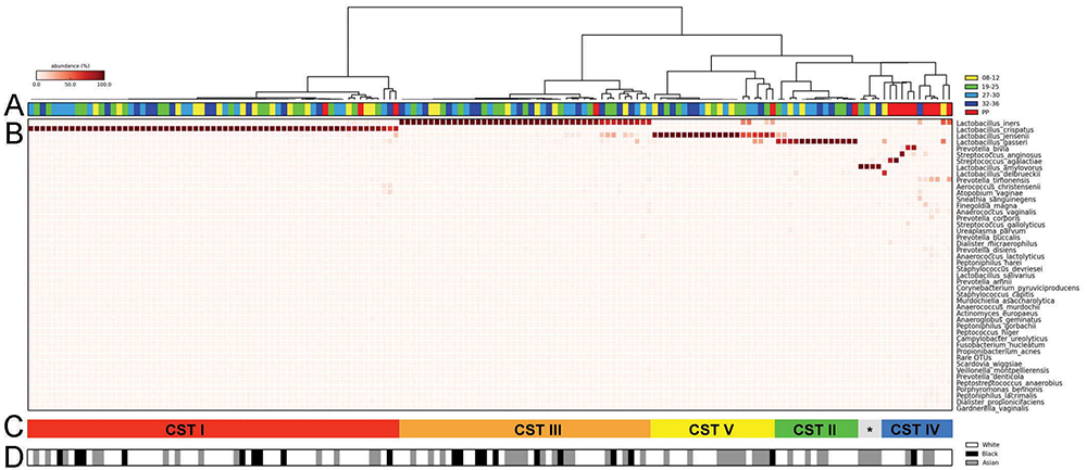 ?。?)在懷孕8周一直到產(chǎn)后,陰道微生物的在種水平上的組成變化圖