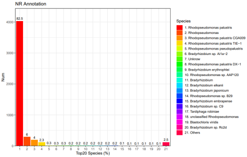 8、 NR數(shù)據(jù)庫注釋:NCBI非冗余蛋白數(shù)據(jù)庫比對得到對應物種分類信息比率,能知道基因組物種信息。