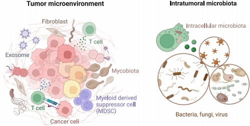 腫瘤微環(huán)境與腫瘤內(nèi)微生物群示意圖