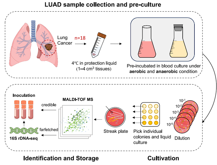 2.微生物培養(yǎng)組學:采用多培養(yǎng)條件(好氧/厭氧+5%羊血/5%瘤胃液)對LUAD原發(fā)灶新鮮樣本進行富集培養(yǎng),分離獲得患者來源的純細菌菌株;