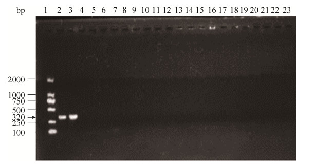 瓊脂糖凝膠電引物對(duì)2陽性檢測(cè)菌株20株陰性檢測(cè)菌株擴(kuò)增結(jié)果