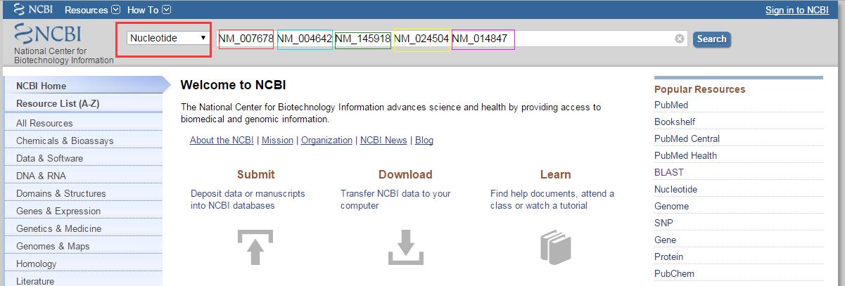 我們以5個(gè)基因序列為例,用NM和GI搜索下載基因序列。在NCBI的Nucleotide數(shù)據(jù)庫輸入NM_007678 NM_004642 NM_145918 NM_024504 NM_014847或GI:131886531 GI:394025684 GI:125987604 GI:359718918 GI:188497757(注意每個(gè)之間要加入空格喲)。點(diǎn)擊“Search”后,會(huì)展示5個(gè)基因序列